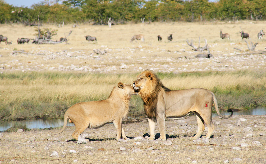 Le jeune et l’ainé Cette impressionnante rencontre entre deux mâles montre la hiérarchie importante qui règne entre les individus d’un groupe. Le jeune lion de gauche montre des signes de soumissions évidents.