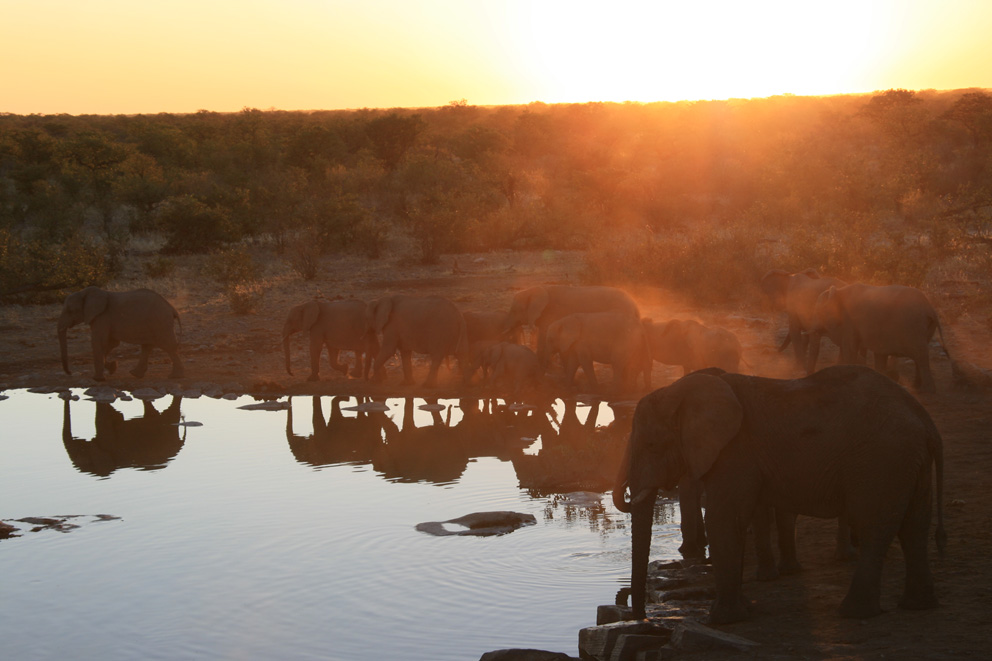 À moins d’un kilomètre de notre site de camping, un point d’eau accessible même de nuit nous permettait d’observer la faune impressionnante du parc d’Etosha. L’aire d’observation était située en hauteur pour éviter de déranger les animaux venant s’abreuver.