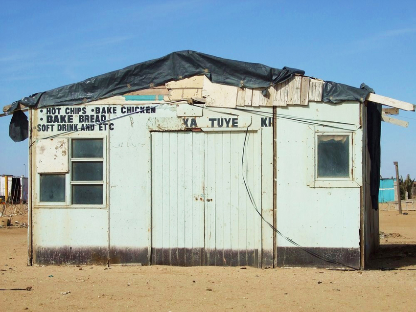Le magasin général du quartier Voici une des plus belles bâtisses du township. On est loin des palmiers et de l’architecture allemande qui domine la ville à un kilomètre de là.