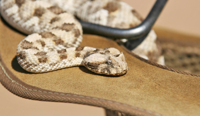 Il y a un serpent dans mon chapeau! Voici la trouvaille de notre guide; une vipère venimeuse (Bitis caudalis) commune dans le désert du namib. Attention de ne pas vous faire mordre car son venin neurotoxique peut vous tuer!