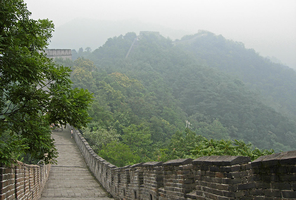 La grande muraille de Chine, dont l’immensité se perd dans la brume de cette journée pluvieuse, proche de Beijing.