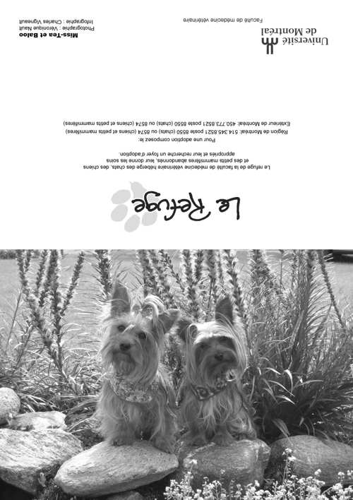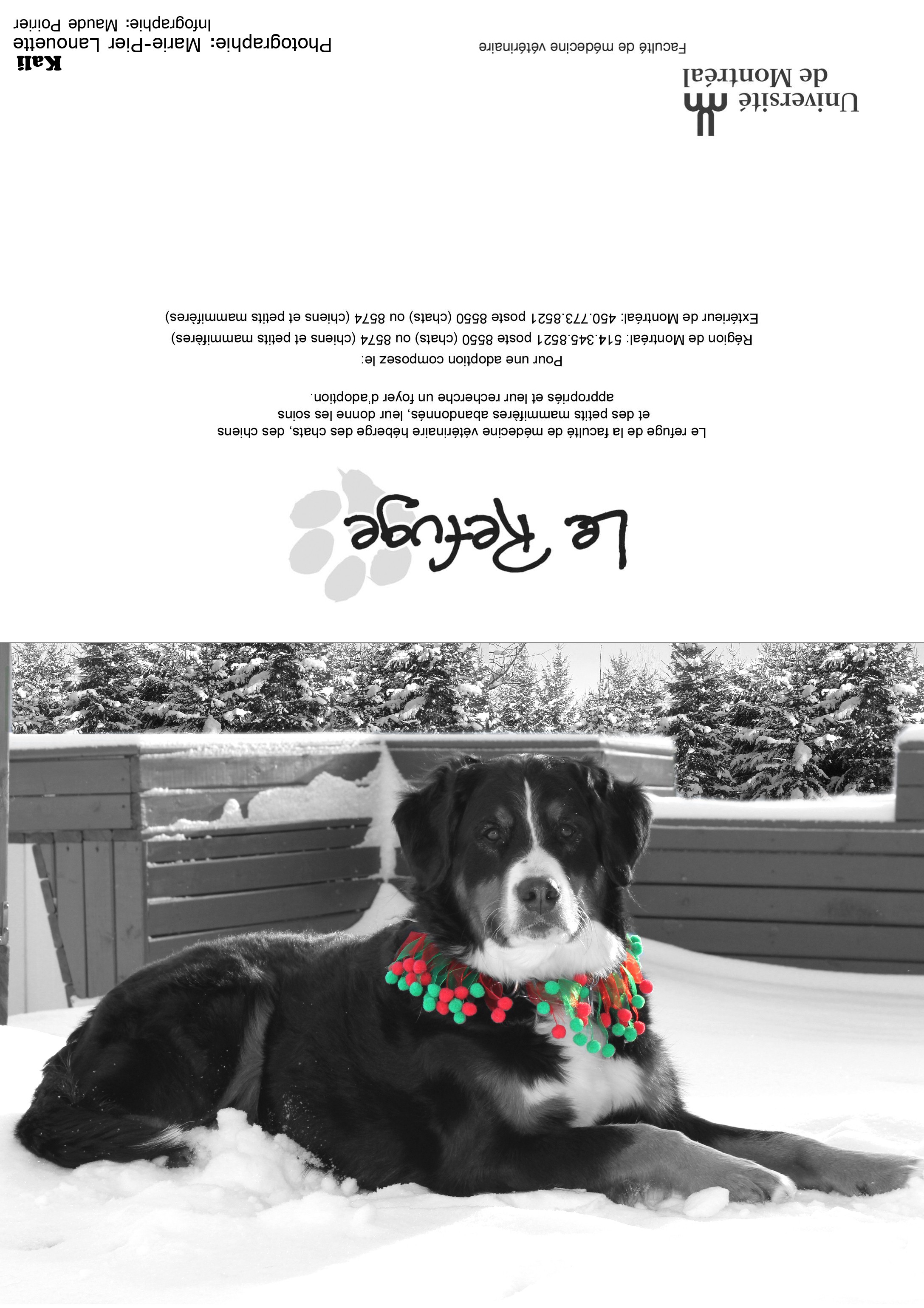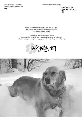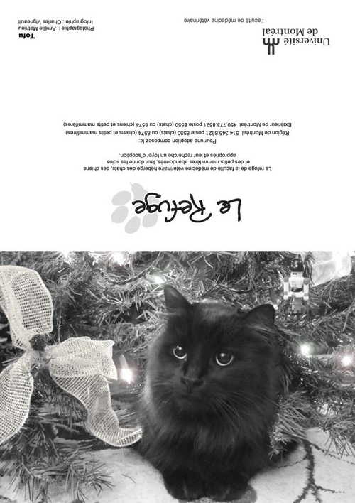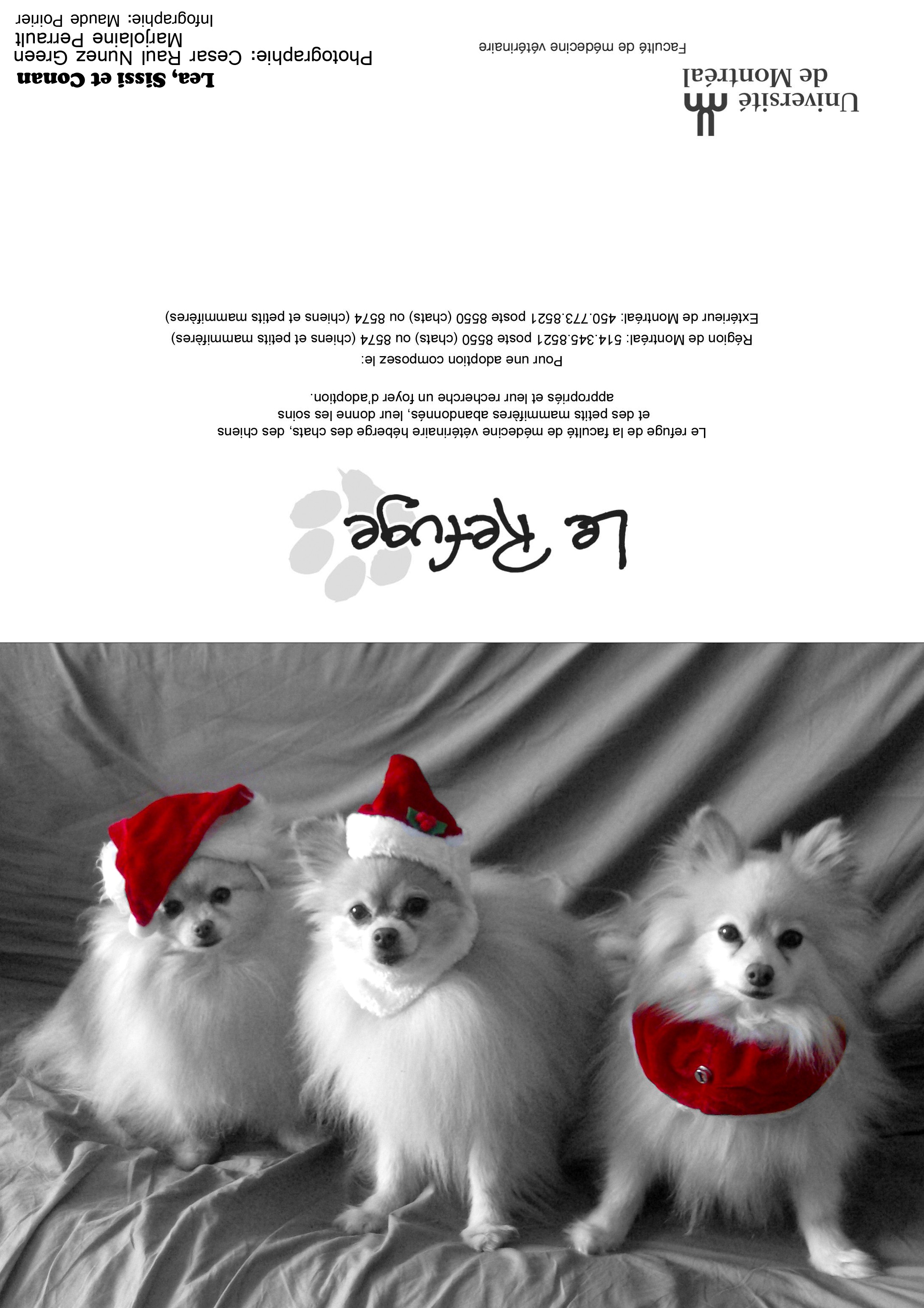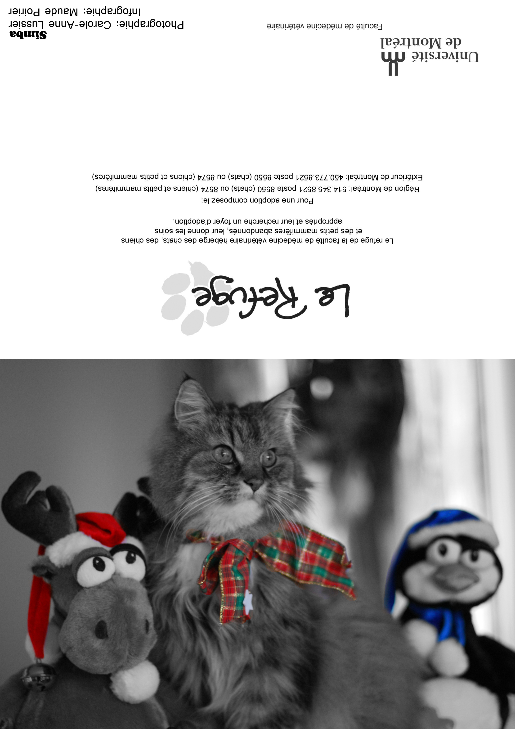 Depuis plusieurs années, les bénévoles du Refuge sollicitent votre appui par la vente de cartes de vœux afin d'amasser les fonds nécessaires au traitement et au soin des animaux durant l'année. Nous offrons plusieurs modèles (voir ci-dessus). La dimension des cartes une fois refermées est de 7x5 pouces. Mentionnons que ces animaux sont passés par le Refuge ou appartiennent à des étudiants(es) en médecine vétérinaire. Quel que soit le modèle choisi, il est possible d'achet à l'unité (3$) ou en paquet de 10 (20$), 50 (65$) ou 100 (100$). Chacun des modèles se retrouve dans les paquets de 10 (20$) ou de 100 (100$). Il est malheureusement impossible de commander une combinaison de modèles en particulier. En effet, la préparation des paquets est faite par des étudiants bénévoles, dont l'emploi du temps très chargé. On peut commander en envoyant le bon de commande (pdf 113 k; visionneuse Acrobat) par télécopie ou par courriel. Télécopieur : (450) 778-8154 |