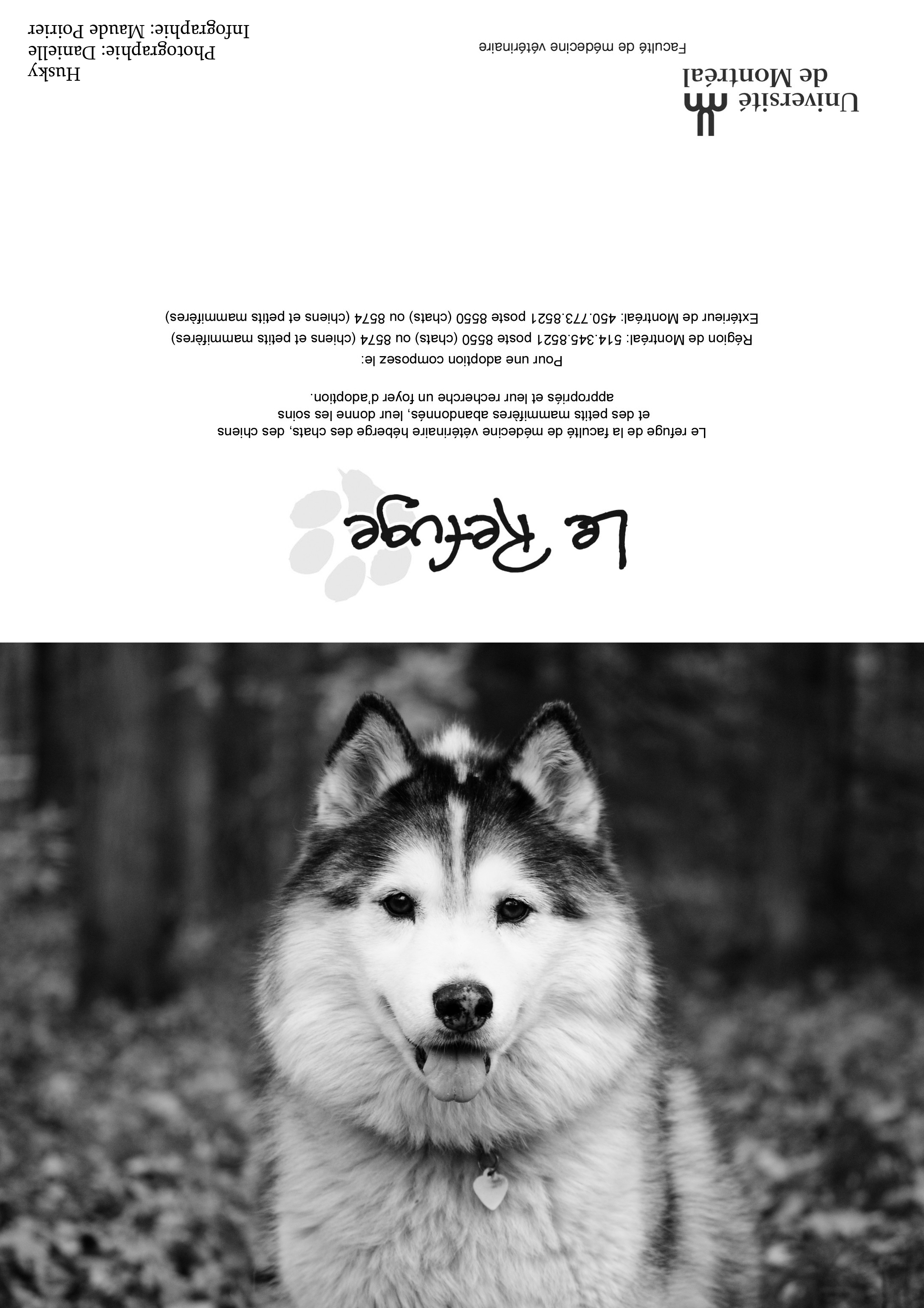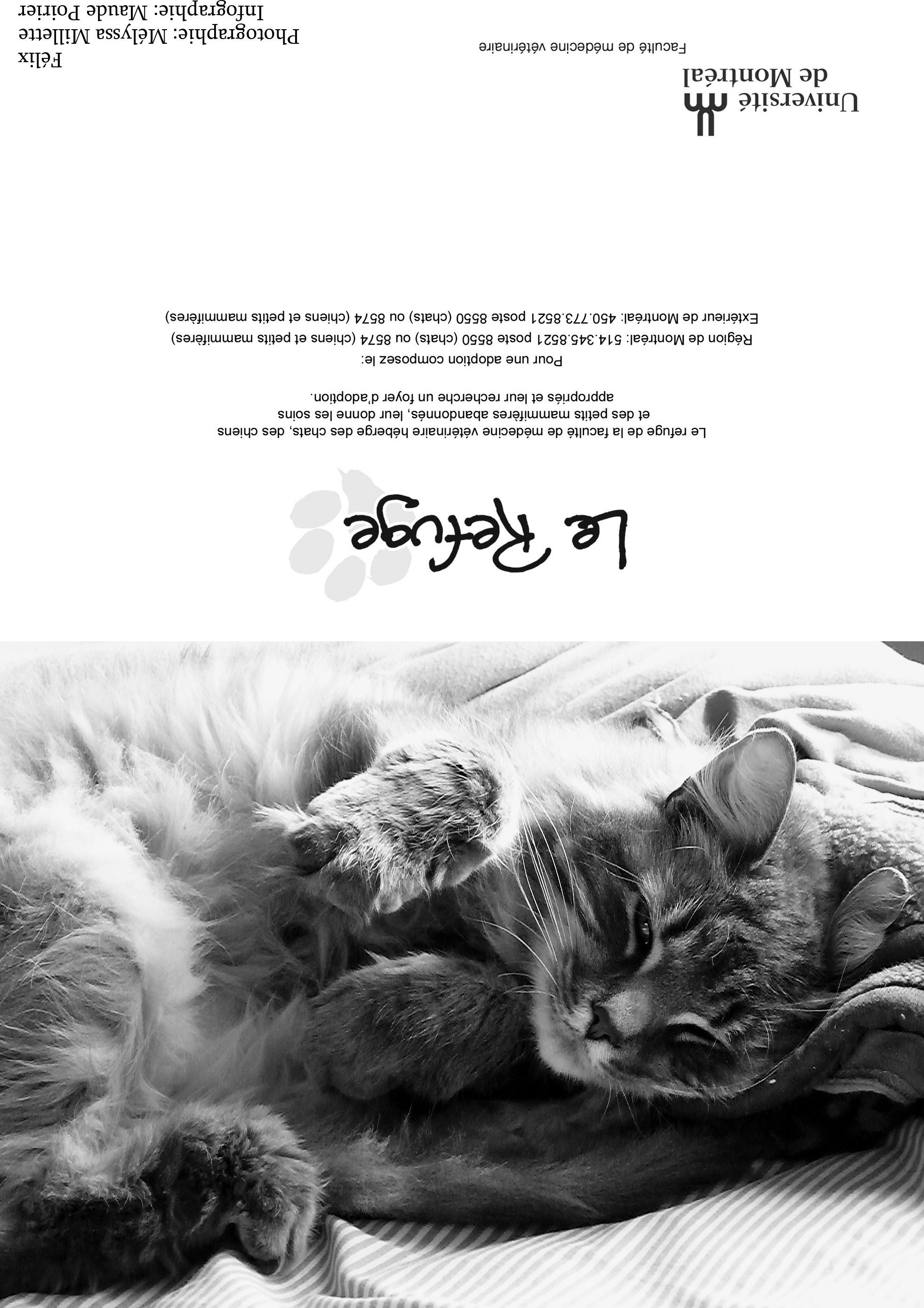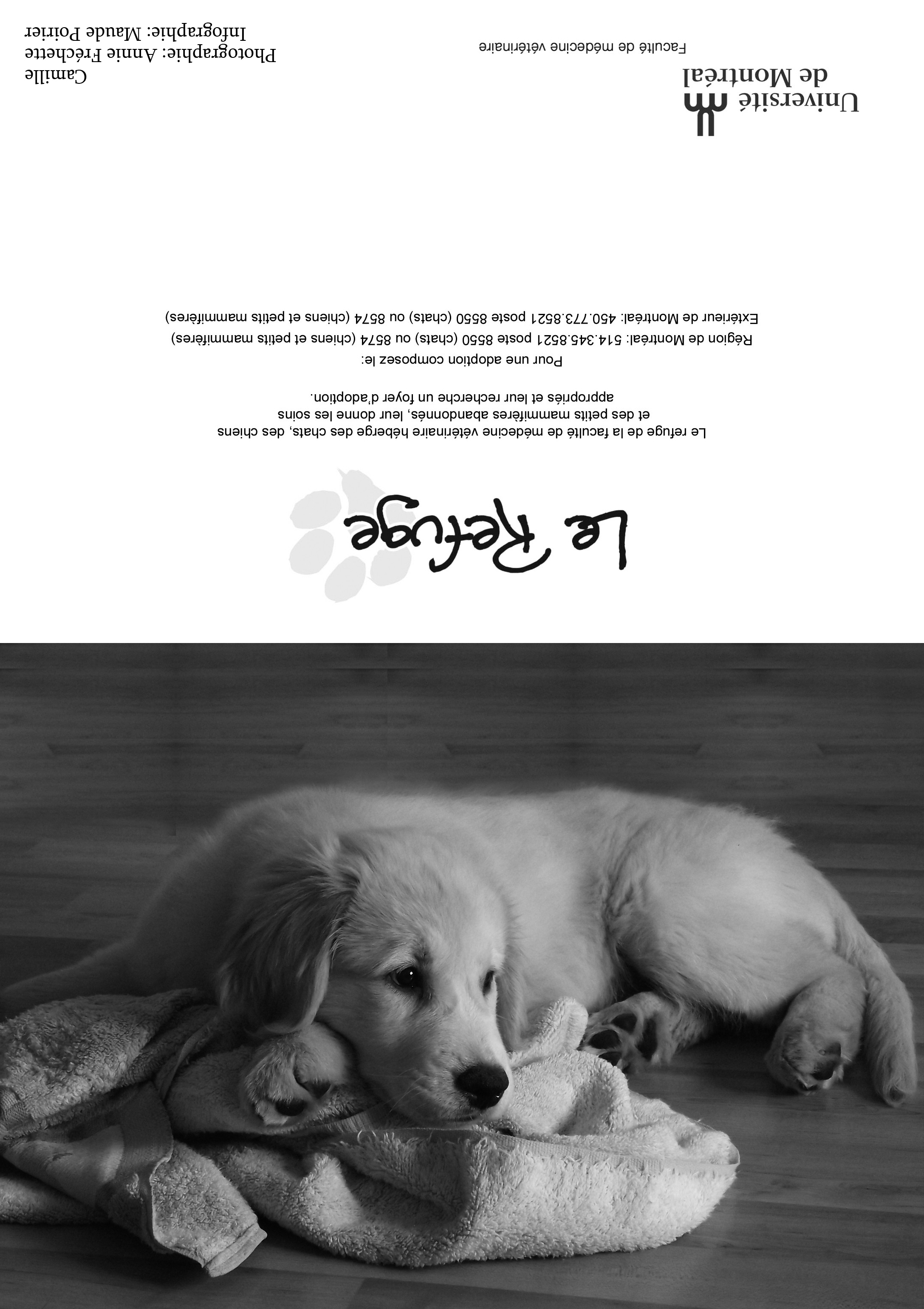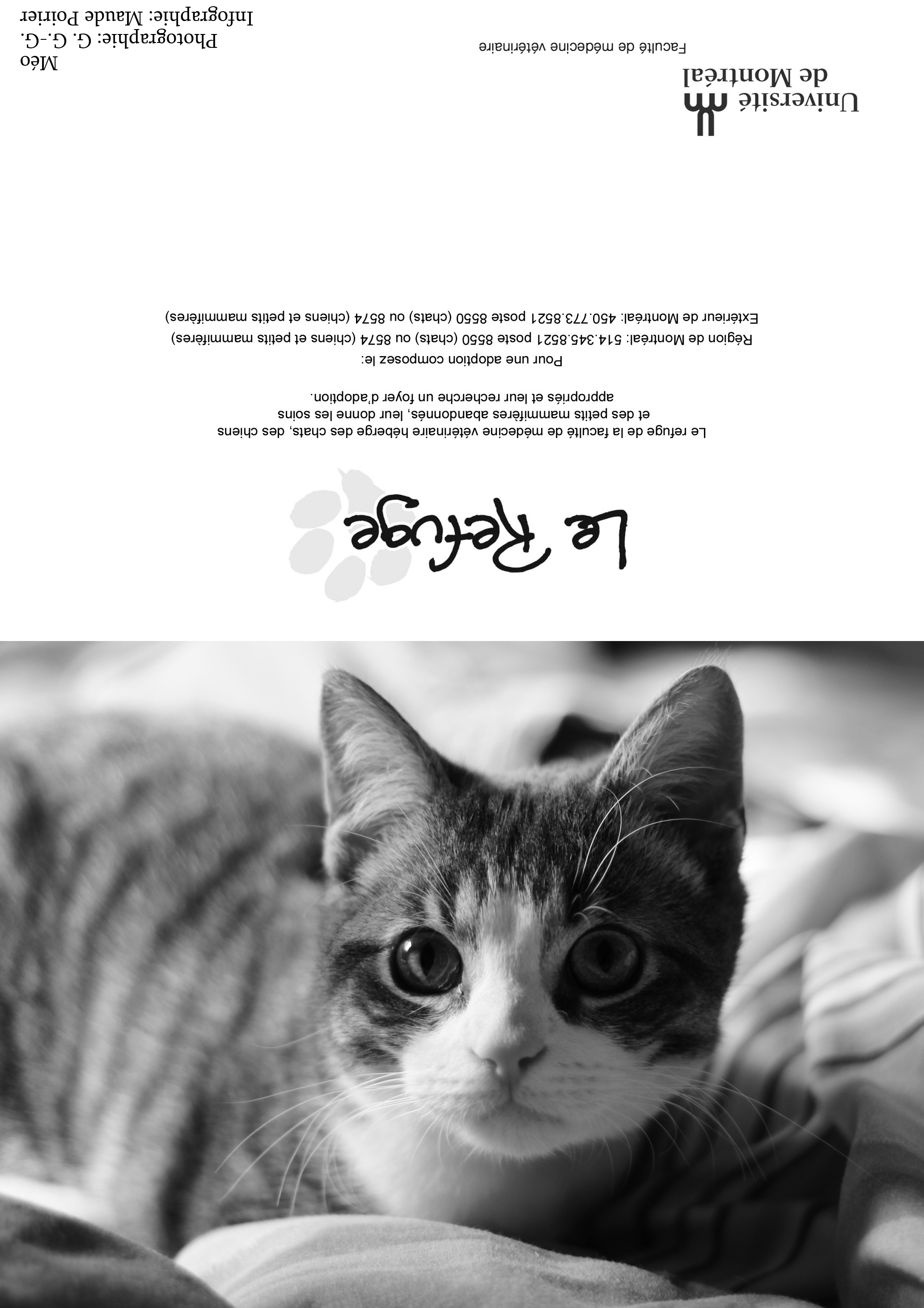 Depuis plusieurs années, les bénévoles du Refuge sollicitent votre appui par la vente de cartes de vœux afin d'amasser les fonds nécessaires au traitement et au soin des animaux durant l'année. Nous offrons plusieurs modèles (voir ci-dessus). La dimension des cartes une fois refermées est de 7x5 pouces. Mentionnons que ces animaux sont passés par le Refuge ou appartiennent à des étudiants(es) en médecine vétérinaire. Quel que soit le modèle choisi, il est possible d'achet à l'unité (3$) ou en paquet de 10 (20$), 50 (65$) ou 100 (100$). Chacun des modèles se retrouve dans les paquets de 10 (20$) ou de 100 (100$). Il est malheureusement impossible de commander une combinaison de modèles en particulier. En effet, la préparation des paquets est faite par des étudiants bénévoles, dont l'emploi du temps très chargé. On peut commander en envoyant le bon de commande (pdf 113 k; visionneuse Acrobat) par télécopie ou par courriel. Télécopieur : (450) 778-8154 |