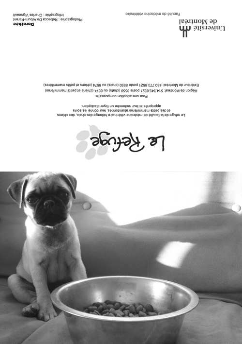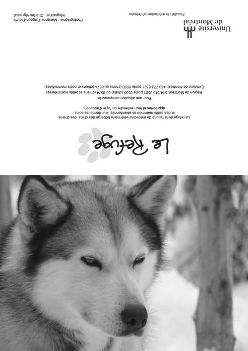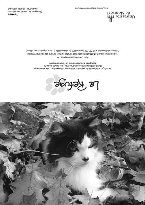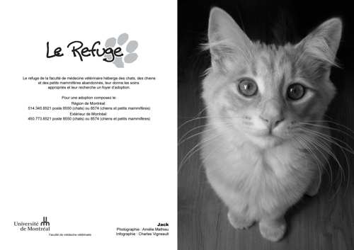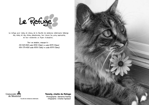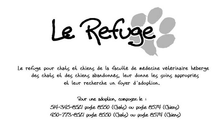 Le Refuge de la Faculté de médecine vétérinaire a été fondé en 1991 à l'initiative de quelques étudiants soucieux du bien-être des chats errants ou en attente de foyer d'adoption et qui souhaitaient voir réduire le nombre d'euthanasies inutiles. À ses débuts, Le Refuge possédait uniquement deux cages dans un local situé à proximité de la Clinique des animaux de compagnie et ne recevait que des chats. Grâce à de généreux donateurs, le Refuge emménagé dans des locaux plus spacieux à l'automne 1999 puis, en décembre 2004, a intégré ses quartiers actuels au dessus de la Clinique des animaux de compagnie. Ces locaux tout neufs comprennent une pièce pour les chats et une pour les chiens prêts pour l'adoption- pour une capacité totale d'environ 35 chats et 6 chiens- d'une salle de traitement, d'une section de conditionnement, d'une salle d'isolement pour les chats et les chiens contagieux ainsi qu'un bureau et de l'espace de rangement. Depuis 2007, le Refuge compte aussi une section pour les petits mammifères située dans le Service de médecine zoologique, qui dispose des installations et du matériel adaptés à leurs besoins particuliers. Il n'y a pas de limite de durée de séjour au Refuge et le taux d'adoption est donc très élevé, soit 98% et seuls les animaux atteints de maladies incurables sont euthanasiés. De sa création à la fin de 2012, le Refuge a permis l'adoption de plus de 3200 chats et de 900 chien. Les statistiques relatives au refuge pour petits mammifères ne sont pas encore disponibles.