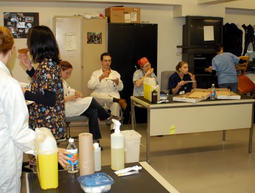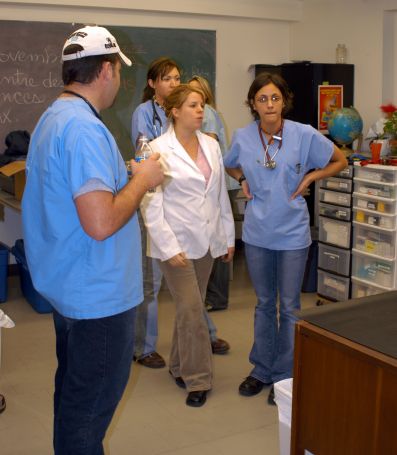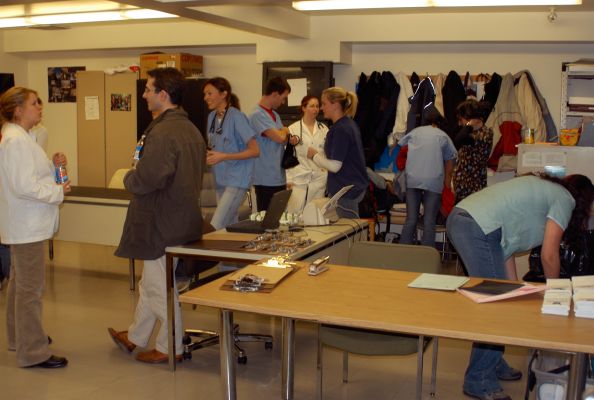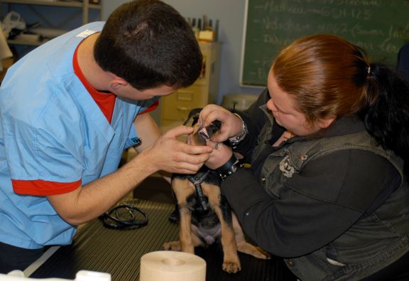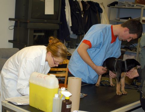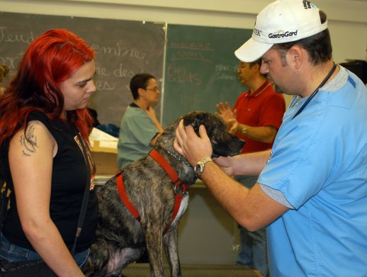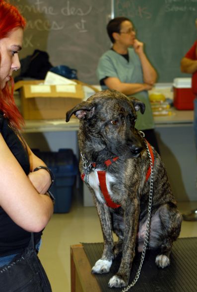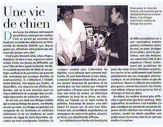 Clinique des animaux des jeunes de la rueÉcouter un reportage radiophonique de la SRC À l’automne 2000, le père Emmet Jones « Pops » de l’organisme « le bon dieu dans la rue » a contacté la direction de la Faculté de médecine vétérinaire afin de présenter la problématique des animaux pour les jeunes de la rue. En effet, le personnel du centre du jour avait noté que certains chiens étaient parfois malades, les jeunes de la rue ayant peu d’argent pour les faire soigner. L’information sur les soins était également souvent absente. Comme suite à ces constatations, « Pops » a été invité à présenter une conférence aux étudiants et au personnel de la FMV. Devant l’intérêt marqué des étudiants vétérinaires à s’investir dans cette cause sociale et suite à l’implication des docteurs André Dallaire, vice-doyen aux études, Diane Blais, vice-doyenne aux affaires étudiantes, et de quelques professeurs, le projet « Les animaux des jeunes de la rue » a été mis sur pied. Le centre de jour « Dans la rue » permet l’accès aux chiens dans ses locaux. Les jeunes peuvent manger, aller à leurs cours, faire différentes activités d’intégration alors que leur animal est au chaud et s’amuse avec leurs amis à quatre pattes dans un local qui leur est réservé. En acceptant la présence des animaux près des jeunes, Pops a pu constater une meilleure assiduité aux activités. La compagnie pharmaceutique Pfizer a été sollicitée pour contribuer à la réalisation du projet et depuis janvier 2001, elle fait don de tous les vaccins, antiparasites nécessaires à la prévention et au traitement des animaux, ainsi que plusieurs médicaments de base permettant de traiter certains problèmes de santé. La compagnie Sys-Vet participe également au projet depuis août 2001 par le don d’un ordinateur équipé d’un logiciel de gestion des dossiers médicaux. Ainsi, tous les dossiers sont informatisés, ce qui permet d’effectuer plus efficacement le suivi des animaux. Le projet met à contribution les étudiants de 3 e année de la Faculté de médecine vétérinaire et les étudiants du programme de technique en santé animale du cégep de Saint-Hyacinthe. Le projet s’inscrit dans le cadre d’un cours au Doctorat en médecine vétérinaire. Cette activité étant fort populaire, nous procédons par tirage au sort afin de déterminer les noms des six étudiants qui assisteront chaque mois à cette soirée de clinique. Ce projet permet d’offrir aux étudiants une exposition en clinique de médecine vétérinaire générale, de rencontrer des jeunes de la rue et de mieux comprendre le phénomène de la marginalisation. Cette activité se déroule un mercredi soir par mois, et ce, durant toute l’année. Au fil des mois, le nombre de visites n’a cessé d’augmenter. Nous examinons présentement de 20 à 30 cas à chaque soirée de clinique au centre de jour. En quatre ans, plus de 650 patients ont ainsi été examinés pour un total d’environ 1 500 consultations. Les soirées cliniques se déroulent au centre de jour de l’organisme « le bon dieu dans la rue » (angle Papineau et Ontario à Montréal). Les intervenants du centre sont responsables de tenir le cahier de rendez-vous. À chaque soirée de clinique, une équipe de six étudiants vétérinaires est assistée d’étudiants en technique de santé animale. Trois cliniciens, un interne ou un résident, deux professeurs et un responsable de la gestion des laboratoires de la Faculté se joignent à l’équipe. À l’arrivée, le jeune est accueilli par deux étudiants qui ouvrent le dossier médical (identification du propriétaire, description de l’animal, raison de la visite, etc.). Par la suite, il est invité à venir rencontrer une équipe d’étudiants qui font les démarches suivantes sous supervision constante d’un vétérinaire :